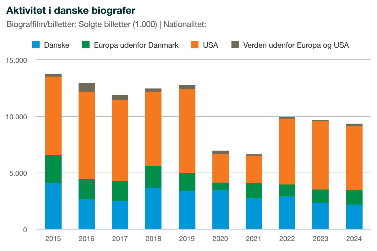 I 2024 blev der solgt 9,4 millioner biografbilletter i Danmark, et fald på 300.000 i forhold til salget i 2023 som var på 9,7 millioner billetter. Dermed er det klart, at biografbranchen slet ikke har hentet sig efter coronaperioden. Inden coronaårene blev der solgt 12-13 millioner billetter årligt.