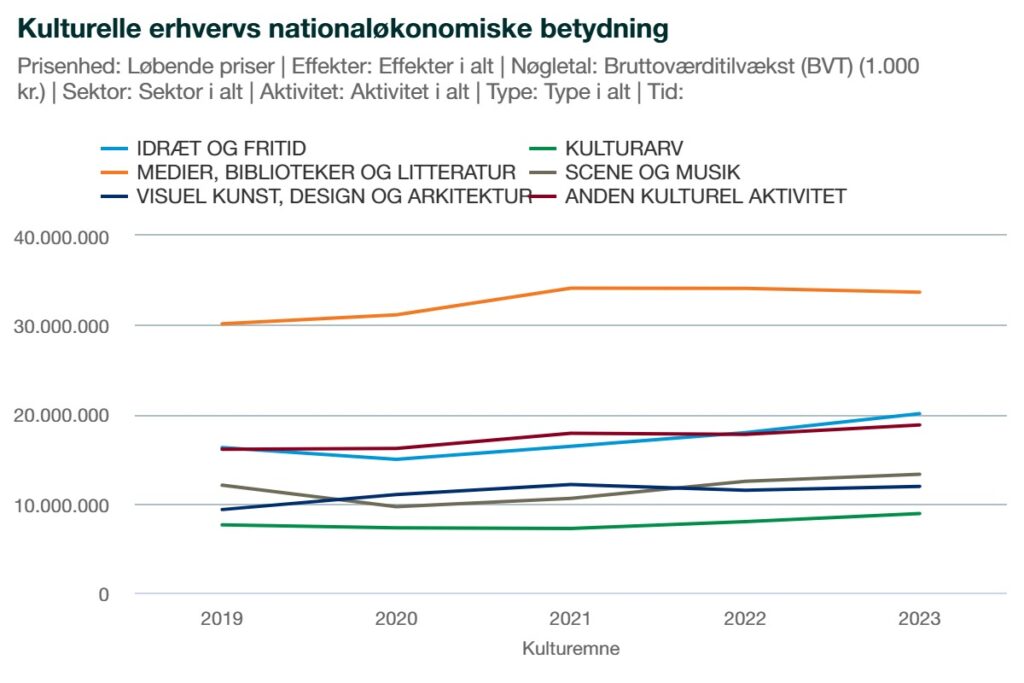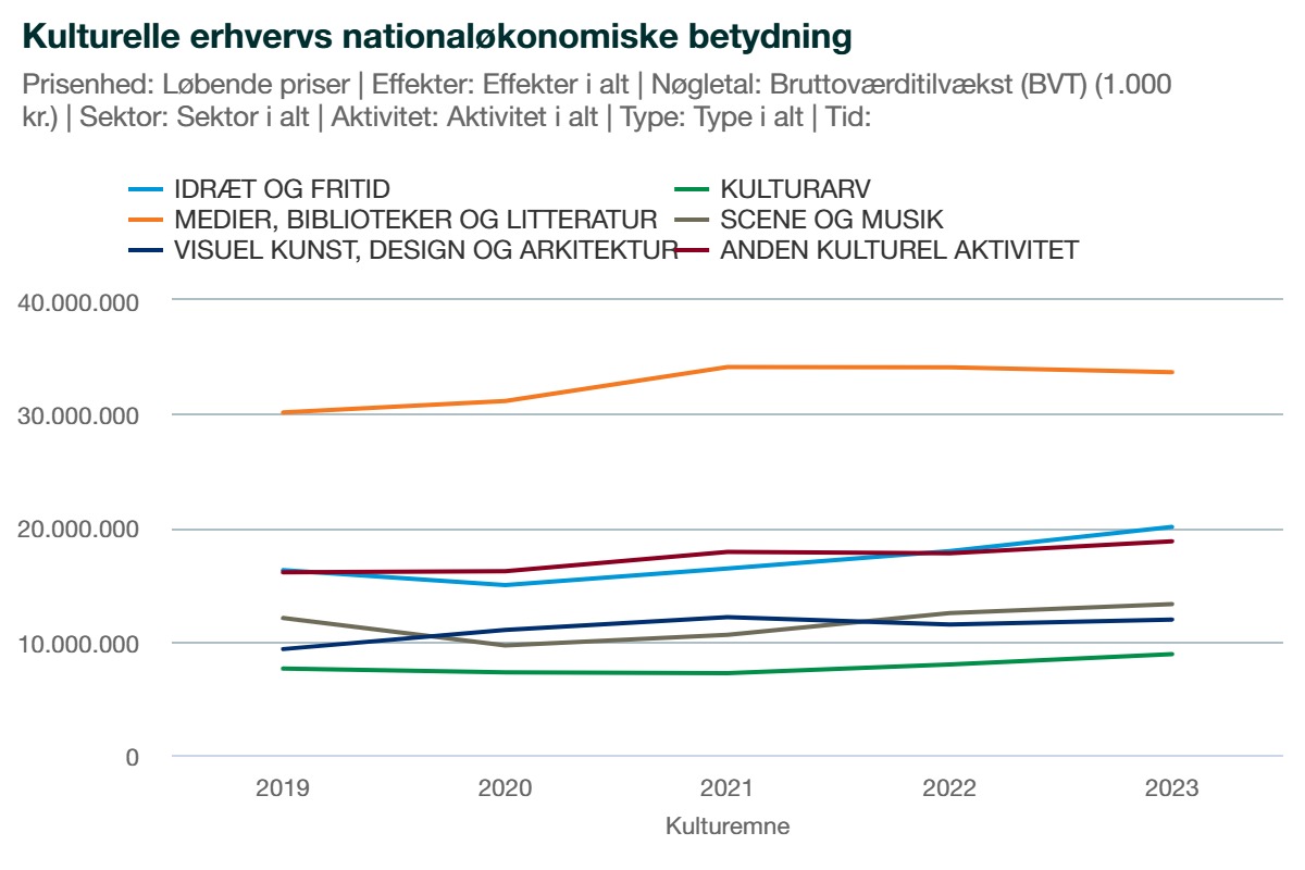 I 2022 skabte kulturerhvervene en samlet bruttoværditilvækst på 101,6 milliarder kr. Dette steg til 106,5 milliarder kr. i 2023. En fremgang på næsten 5 milliarder kr., svarende til 4,8 procent.